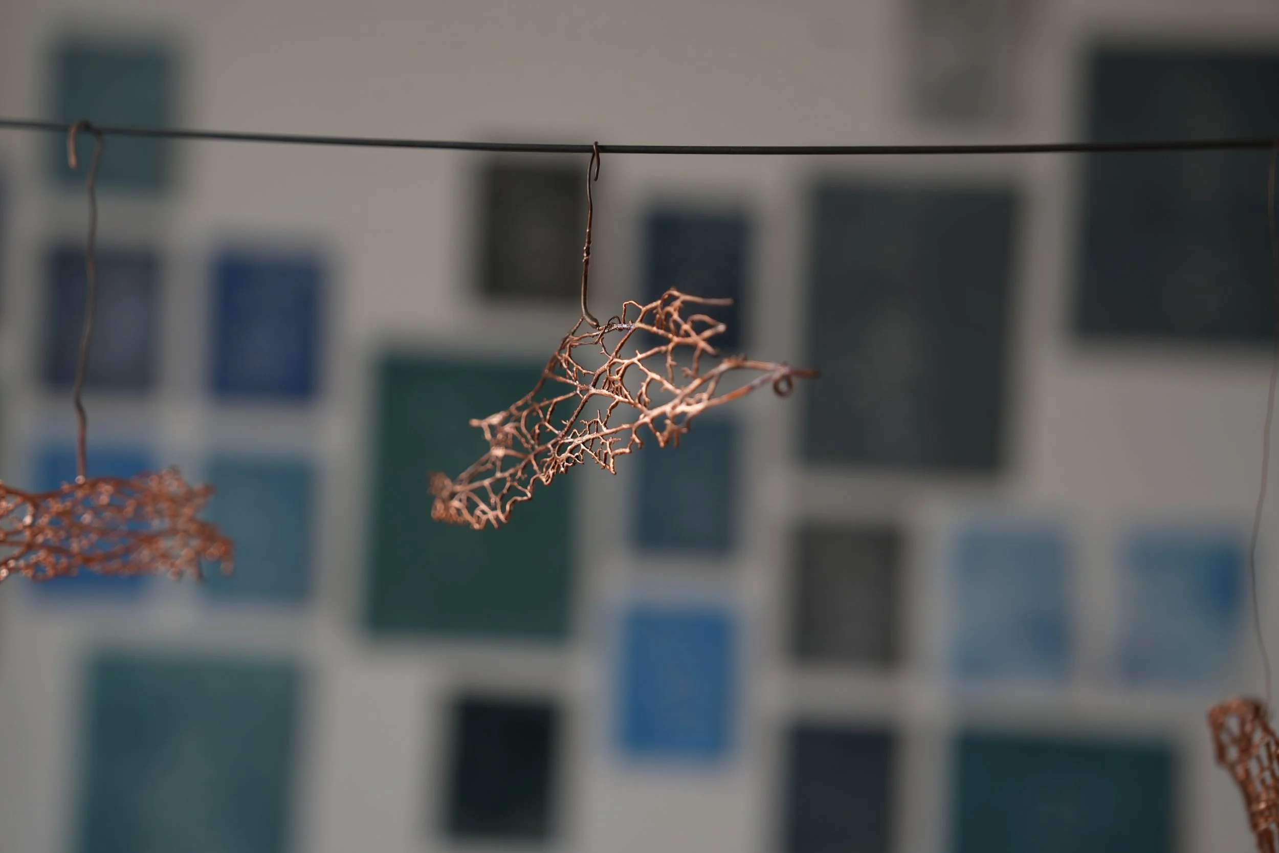 exposition collective à L-imprimerie 2024, peinture acrylique,cuivre, éléments naturels